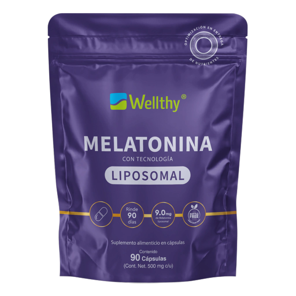 Suplemento alimenticio con tecnología liposomal que contiene 9 mg de melatonina por cápsula. Presentación de 90 cápsulas, rinde hasta 90 días de consumo. Empaque ecológico Bottle Free.